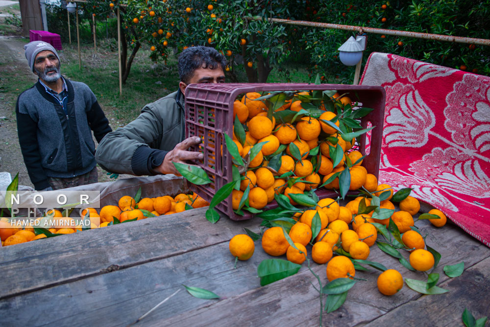 حضور زنان سرپرست خانوار در فصل برداشت پرتغال در باغات شیرگاه استان مازندران.